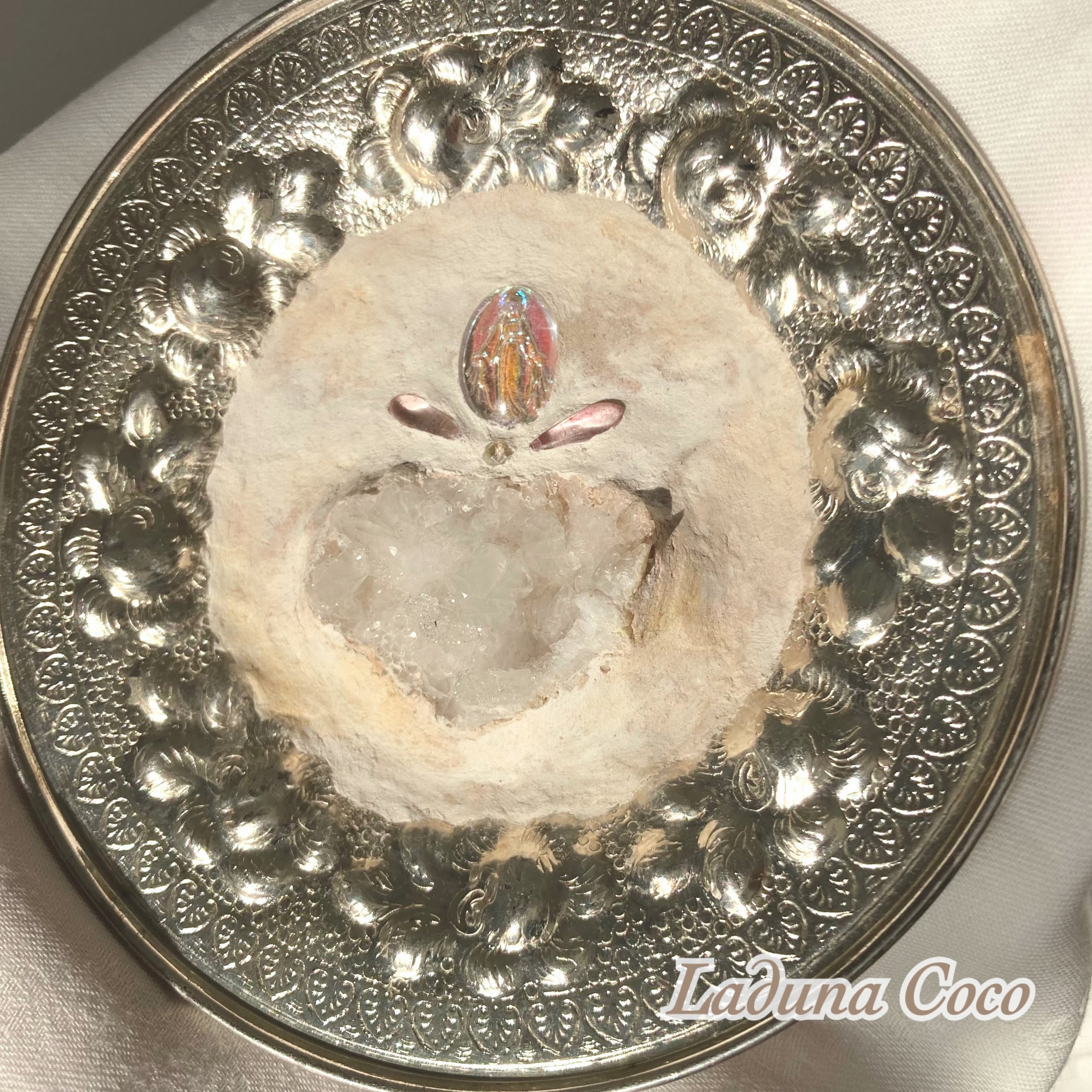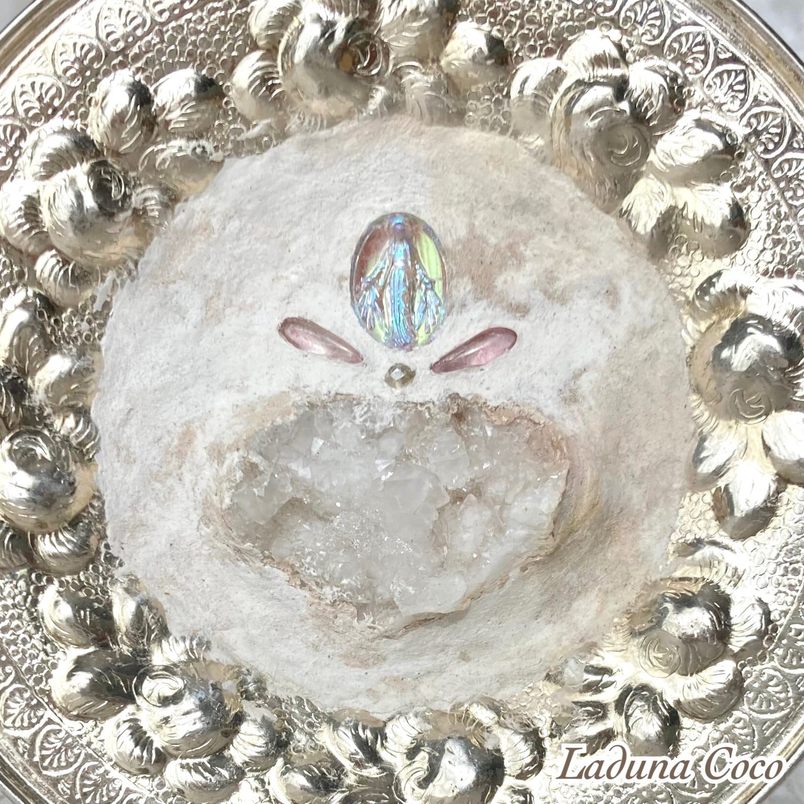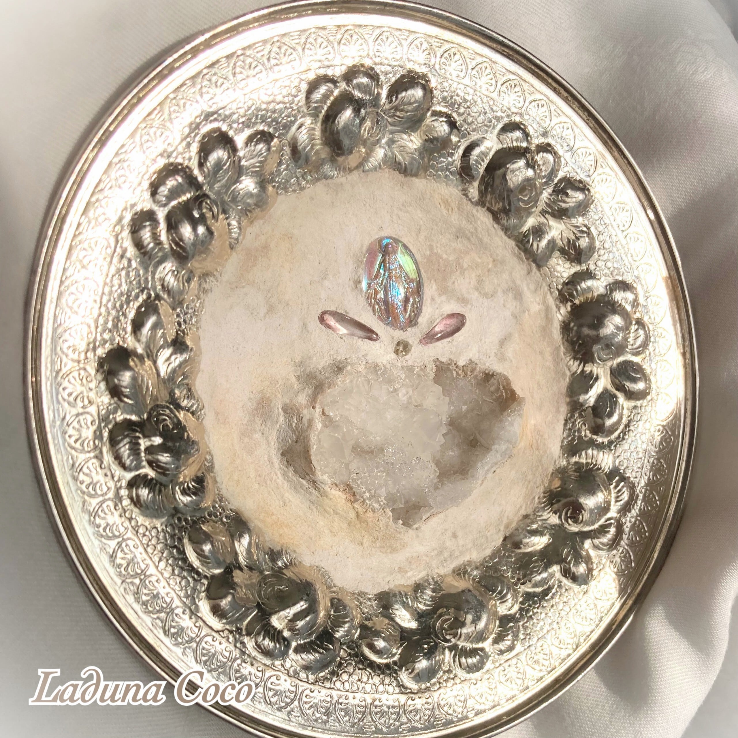 光の当たり具合によって、メダイの色や土台の質感の変化を楽しむことができます。